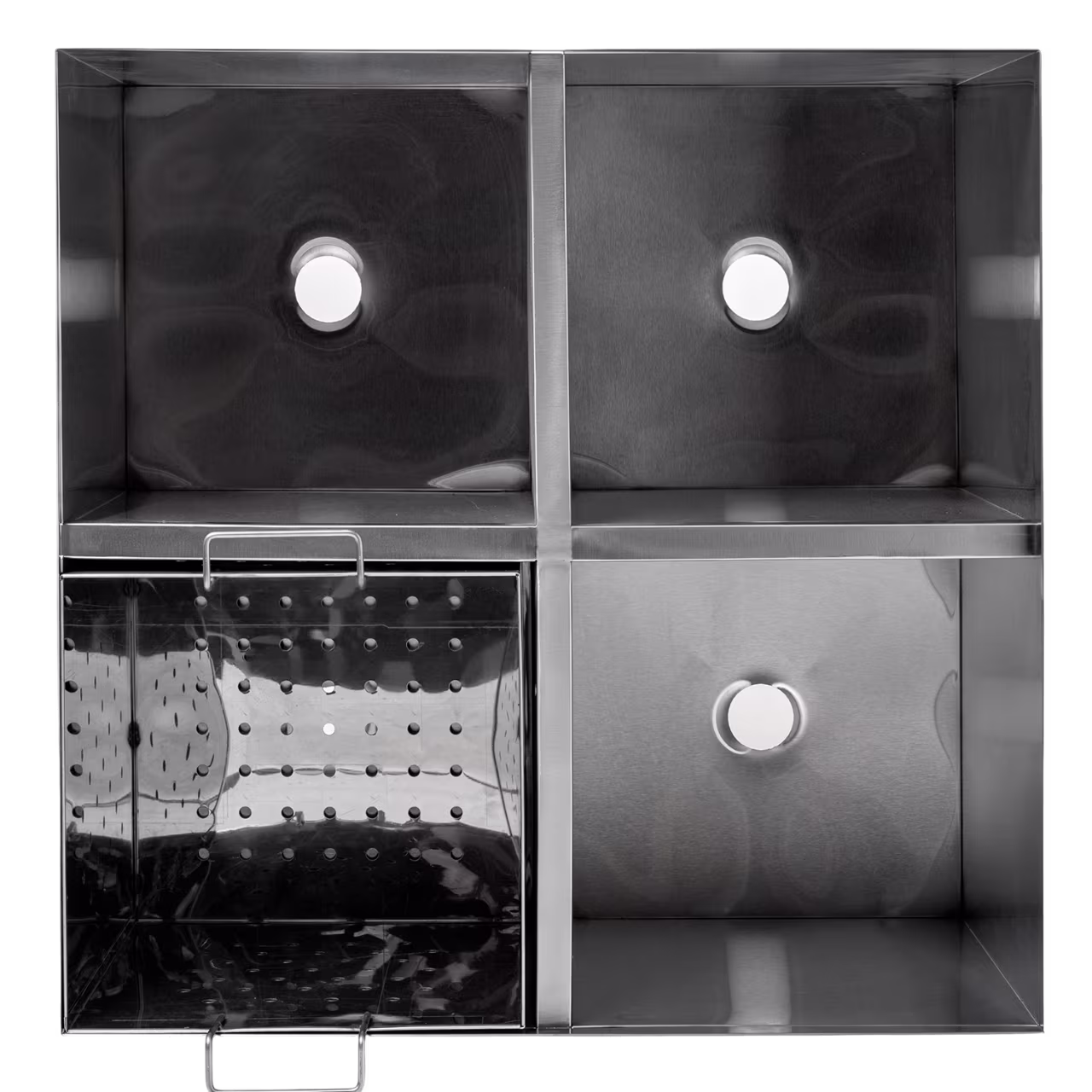🔧 Конструкция состоит из четырёх отдельных секций размером 200×200×300 мм, выполненных из нержавеющей стали AISI 430. В комплект входит перфорированная корзина для удобной загрузки и выгрузки.