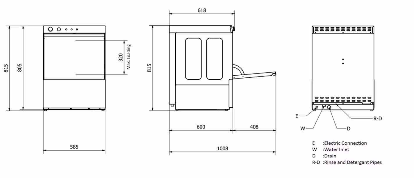 📏 Габариты оборудования — 585×618×815 мм (в открытом виде глубина увеличивается до 1008 мм), предусмотрены регулируемые по высоте ножки. В комплект входят кассеты для тарелок, стаканов и столовых приборов, а также шланги подключения и слива.
